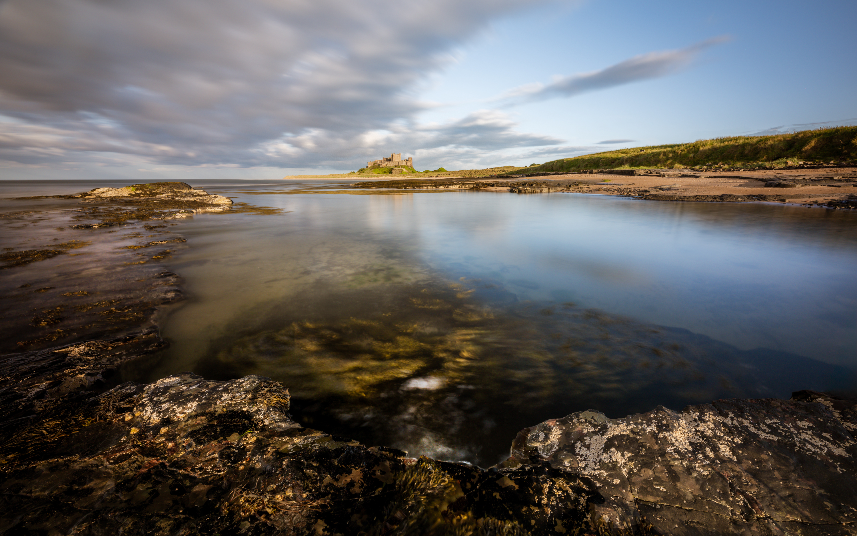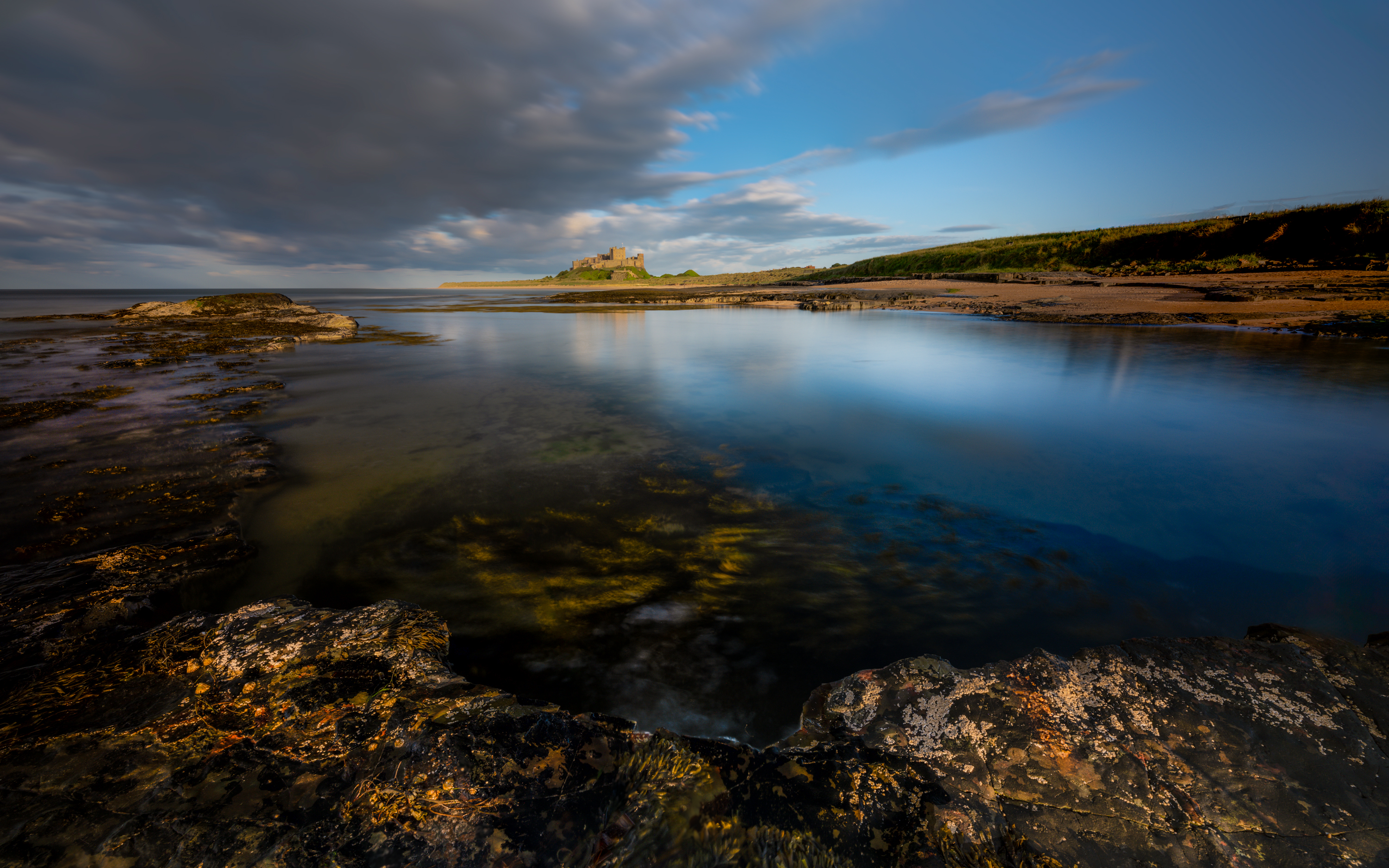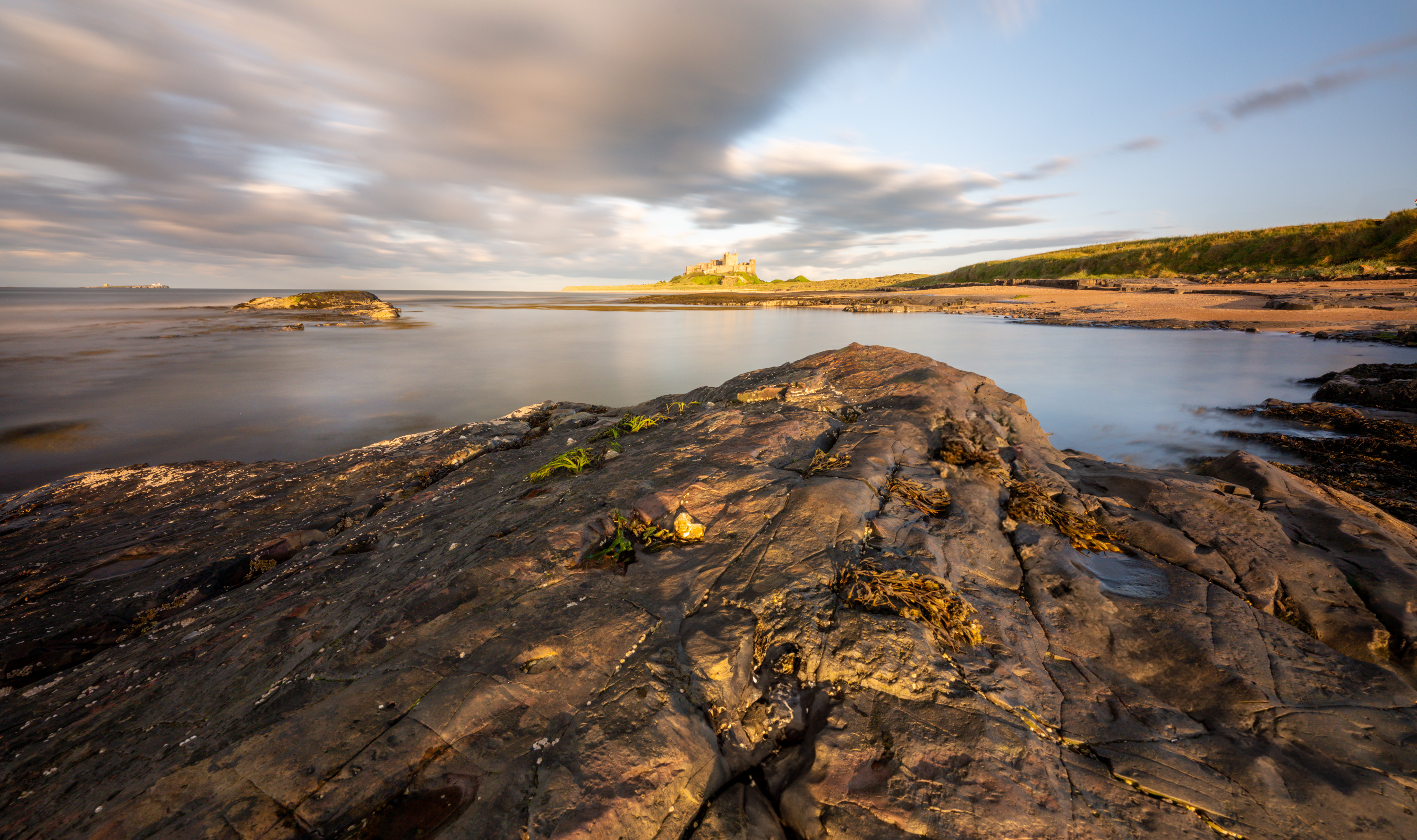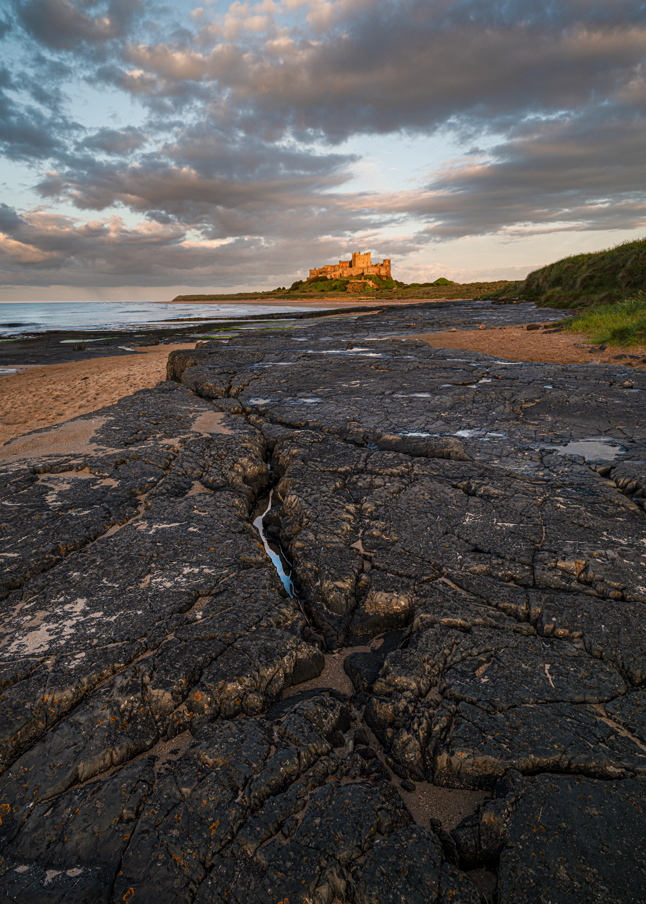 Bamburgh Castle, on the northeast coast of England, by the village of Bamburgh in Northumberland, is a Grade I listed building. The site was originally the location of a Celtic Brittonic fort known as Din Guarie and may have been the capital of the kingdom of Bernicia from its foundation c. 420 to 547.