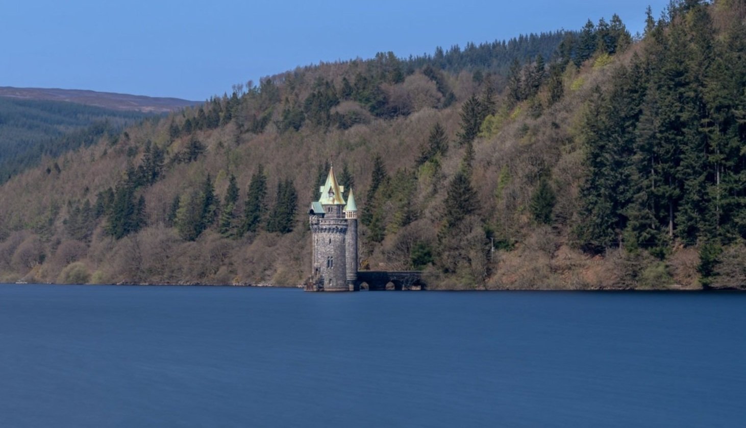 Lake Vyrnwy is a reservoir in Powys, Wales, built in the 1880s for Liverpool Corporation Waterworks to supply Liverpool with fresh water. It flooded the head of the Vyrnwy valley and submerged the village of Llanwddyn.
