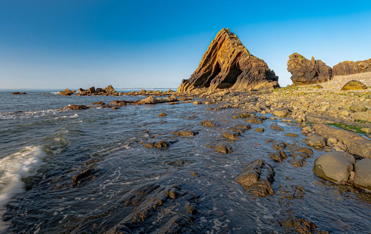 The impressive Blackchurch Rock, which is a large arch stack found at Mouthmill, provides exposures of the Hartland Quay Shale that contains goniatite fossils.